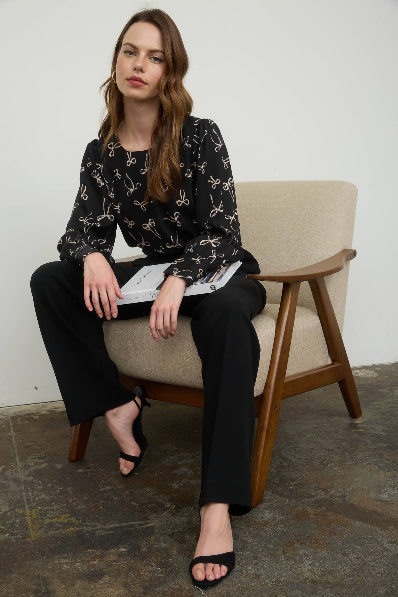 BOW PATTERN ROUND NECK LONG SLEEVE BLOUSE